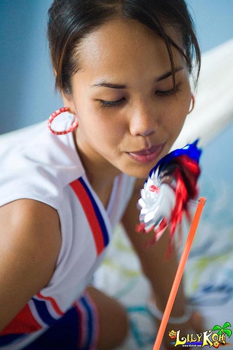 Lily Koh: Petite teen cheerleader flashes tiny nipples and panties