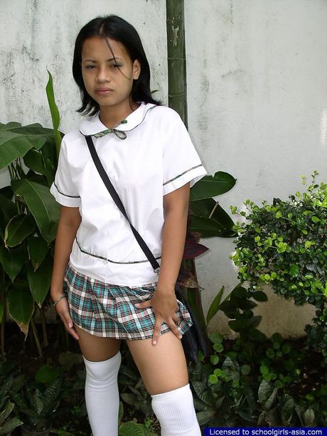 Schoolgirls Asia: Very cute Asian student stripping outdoors to flash her bald pussy